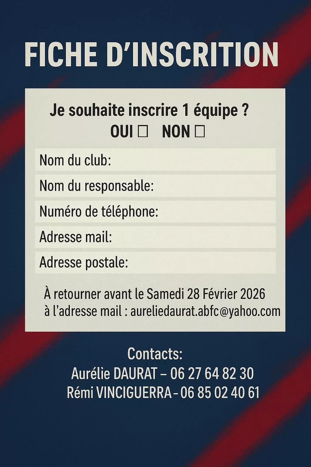 Pour vous inscrire, il vous suffit de de retourner le bulletin d’inscription ci-joint avant le Samedi 28 Février.