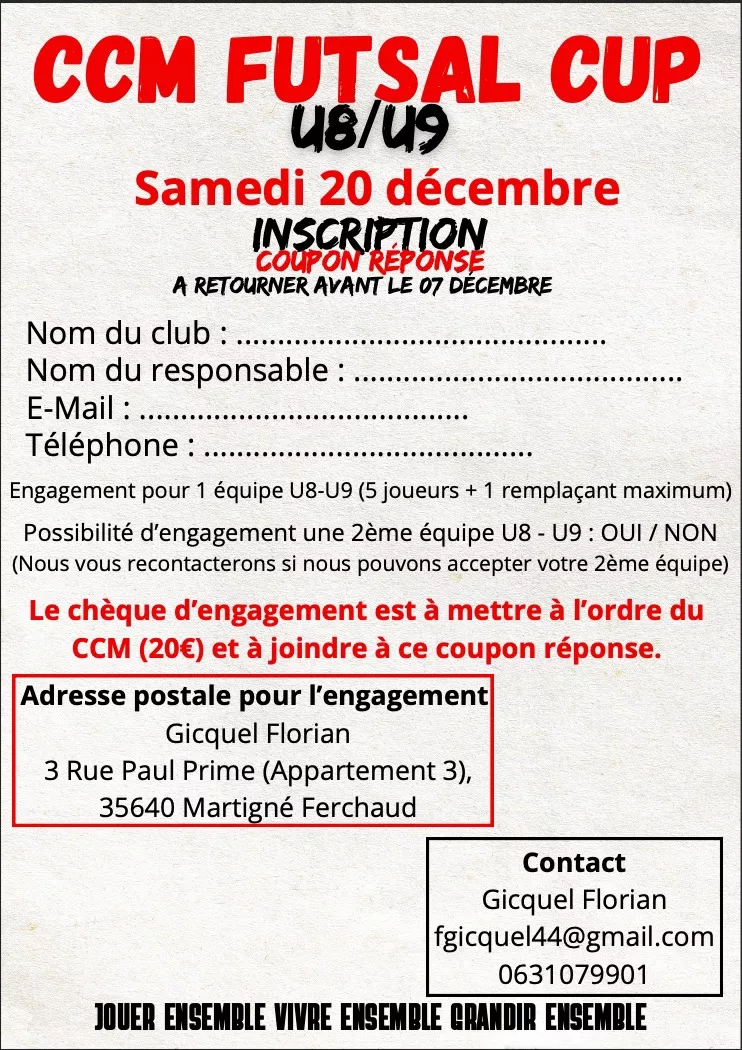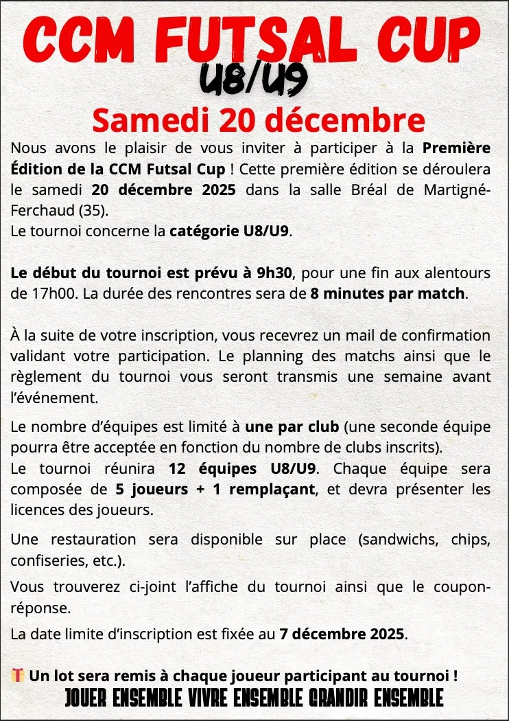 Nous avons le plaisir de vous inviter à la première édition de la CCM Futsal Cup, qui se tiendra le samedi 20 décembre à la salle Bréal.