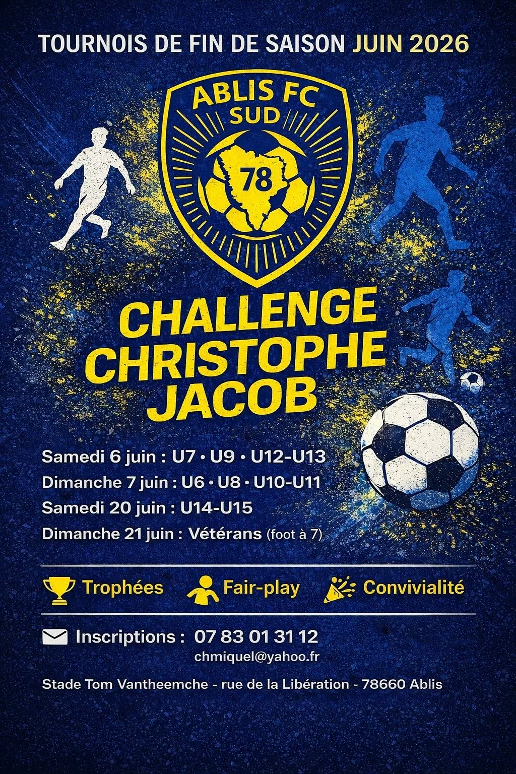 Le club Ablis FC SUD 78 a le plaisir de vous inviter à participer à ses tournois de fin de saison – Challenge Christophe Jacob, organisés au mois de juin 2026 au stade Tom Vantheemche à Ablis (78).