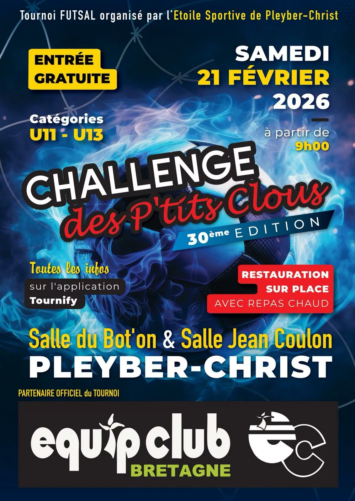 Bienvenue à Pleyber-Christ, pour cette 30ème édition du Challenge des P’tits Clous, tournoi en salles réservé aux catégories U11 et U13. 🏆