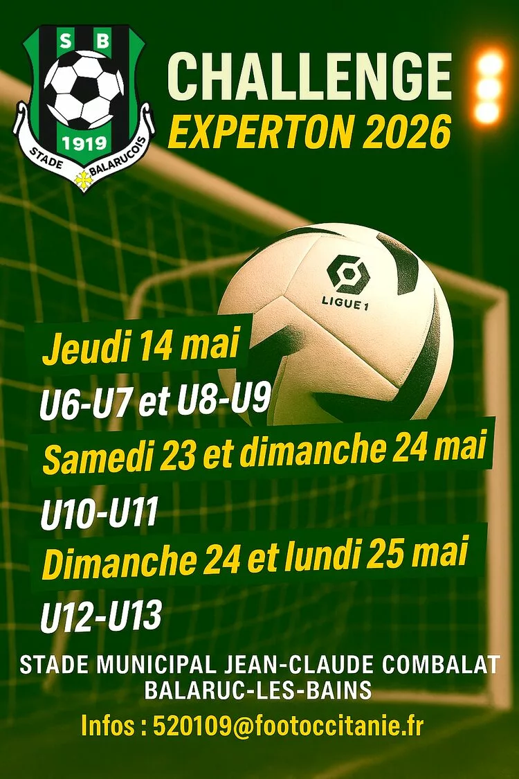 Le STADE BALARUCOIS organise ses « Challenges EXPERTON » au mois de mai 2026 de la catégorie U6 à U13 au Stade Municipal Jean-Claude COMBALAT de la Ville de Balaruc Les Bains (34540).