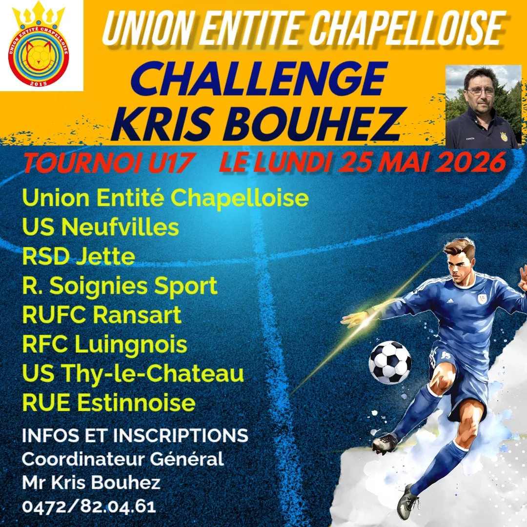 L’Union Entité Chapelloise a l’honneur de vous présenter le Challenge Kris Bouhez, un tournoi U17 de prestige organisé en l’honneur de notre Coordinateur Général.