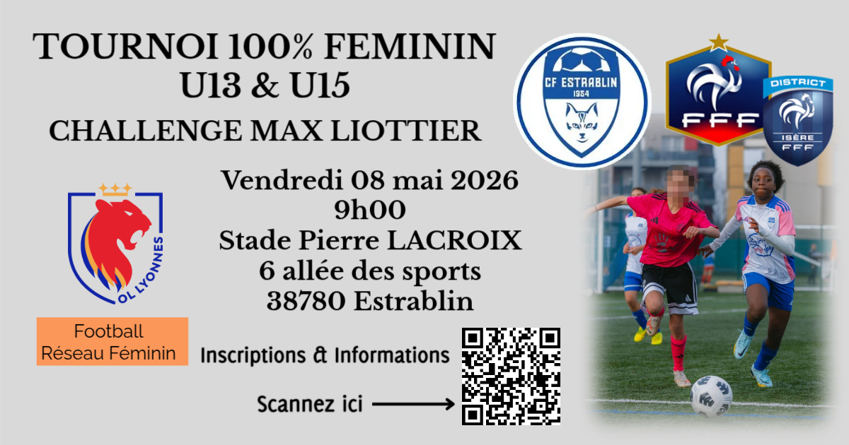 Le CF ESTRABLIN, est ravie de vous inviter à notre événement sportif, Tournoi 100% Féminin U13F et U15F à 8 – 2ème Edition « Challenge Max LIOTTIER », qui se déroulera le vendredi 08 mai 2026 au Stade Pierre LACROIX, 6 allée des sports, 38780 Estrablin et de 09h00 à 18h00 sur 4 terrains à 8 en herbe.