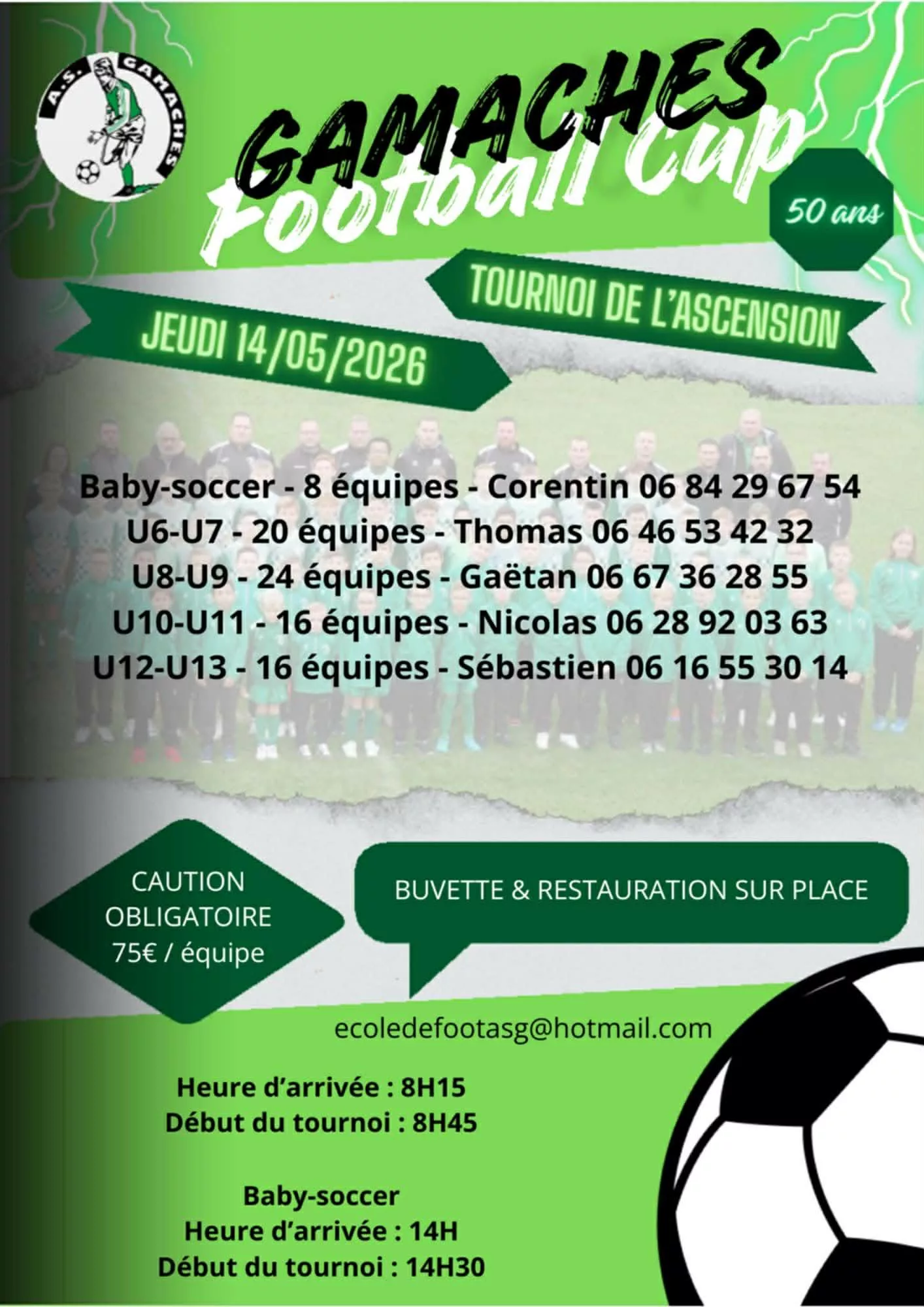 L’affiche de notre grand tournoi de l’ascension est arrivée! Cette année sera exceptionnelle puisque nous fêterons les 50 ans du tournoi. Un demi-siècle de petits verts qui ont foulé les pelouses gamachoises.