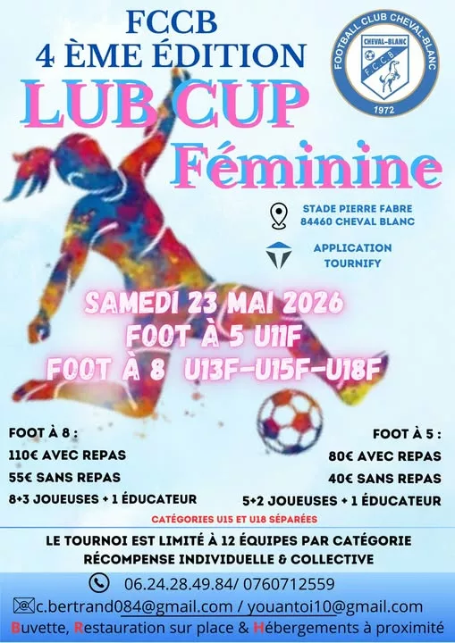 Le F.C. Cheval Blanc (84) organise son tournoi annuel le Samedi 23 Mai 2026 pour les catégories féminines de u11F à u18F.