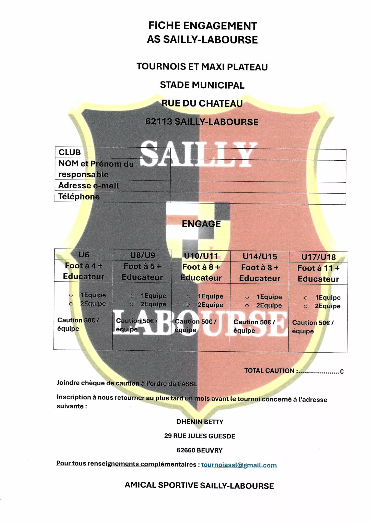 L’As Sailly-Labourse a le plaisir de vous convier à ses différents tournois et maxi plateau ( pour les U6/U8/U9) au stade municipale de Sailly-Labourse à partir de 9h.