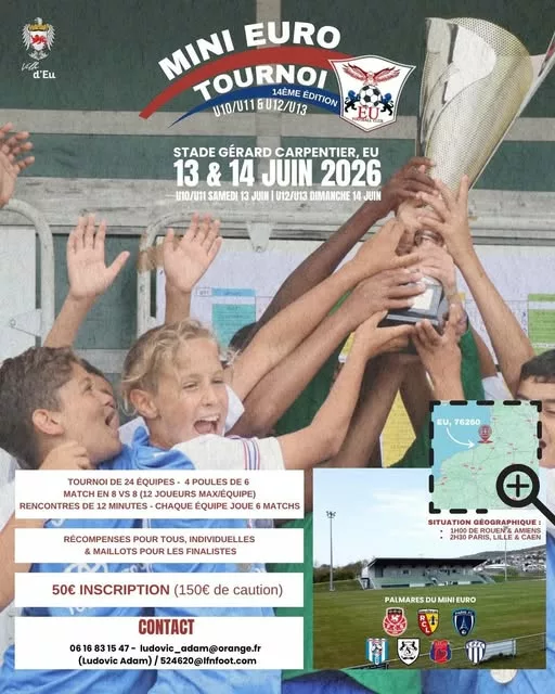 Le tournoi événement de l’Eu Football Club revient en 2026 pour sa 14ème édition ! Rendez-vous les samedi 13 et dimanche 14 juin 2026 au Stade Gérard Carpentier à Eu (76260).