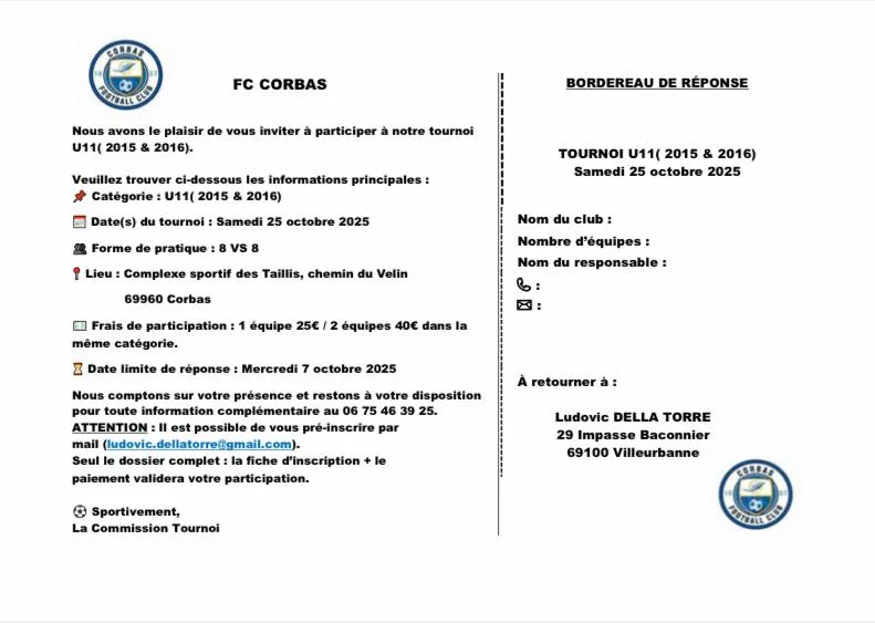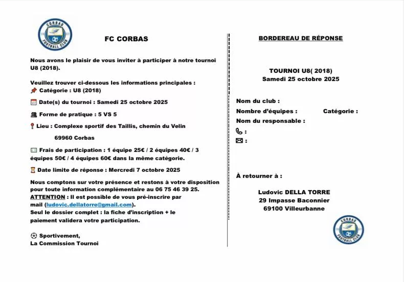 Il reste encore quelques places dans certaines catégories aux tournois de U6 à U13 du FC Corbas.