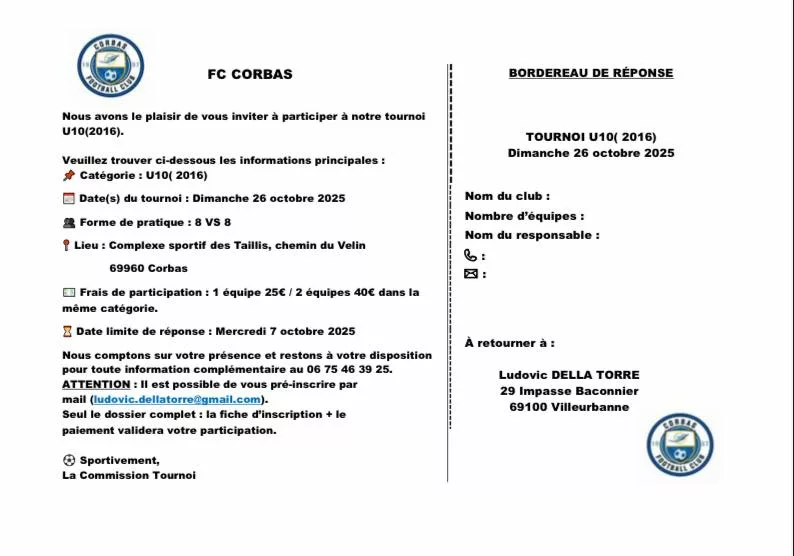 Vous trouverez ci-joint le bulletin réponse à nous renvoyer au plus tôt et impérativement avant le Mercredi 7 octobre 2025 à l’adresse indiquée, accompagné du réglement : virement, chèque de participation.