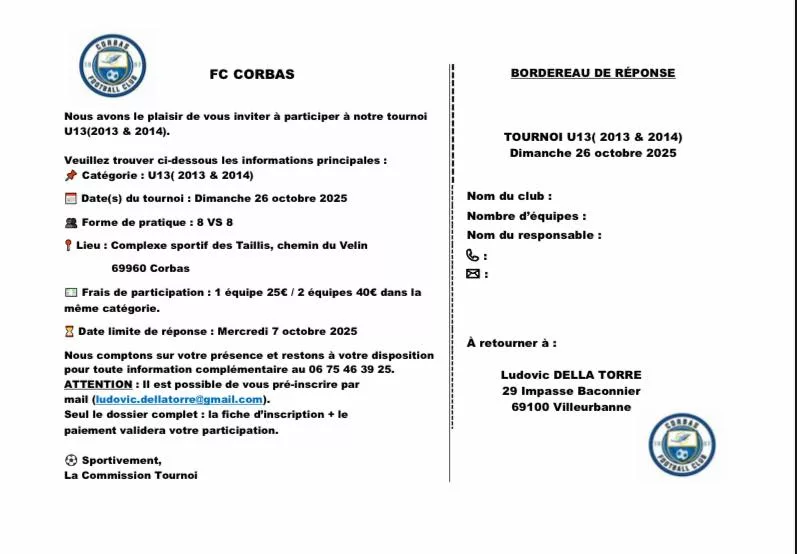Il reste encore quelques places dans certaines catégories aux tournois de U6 à U13 du FC Corbas.