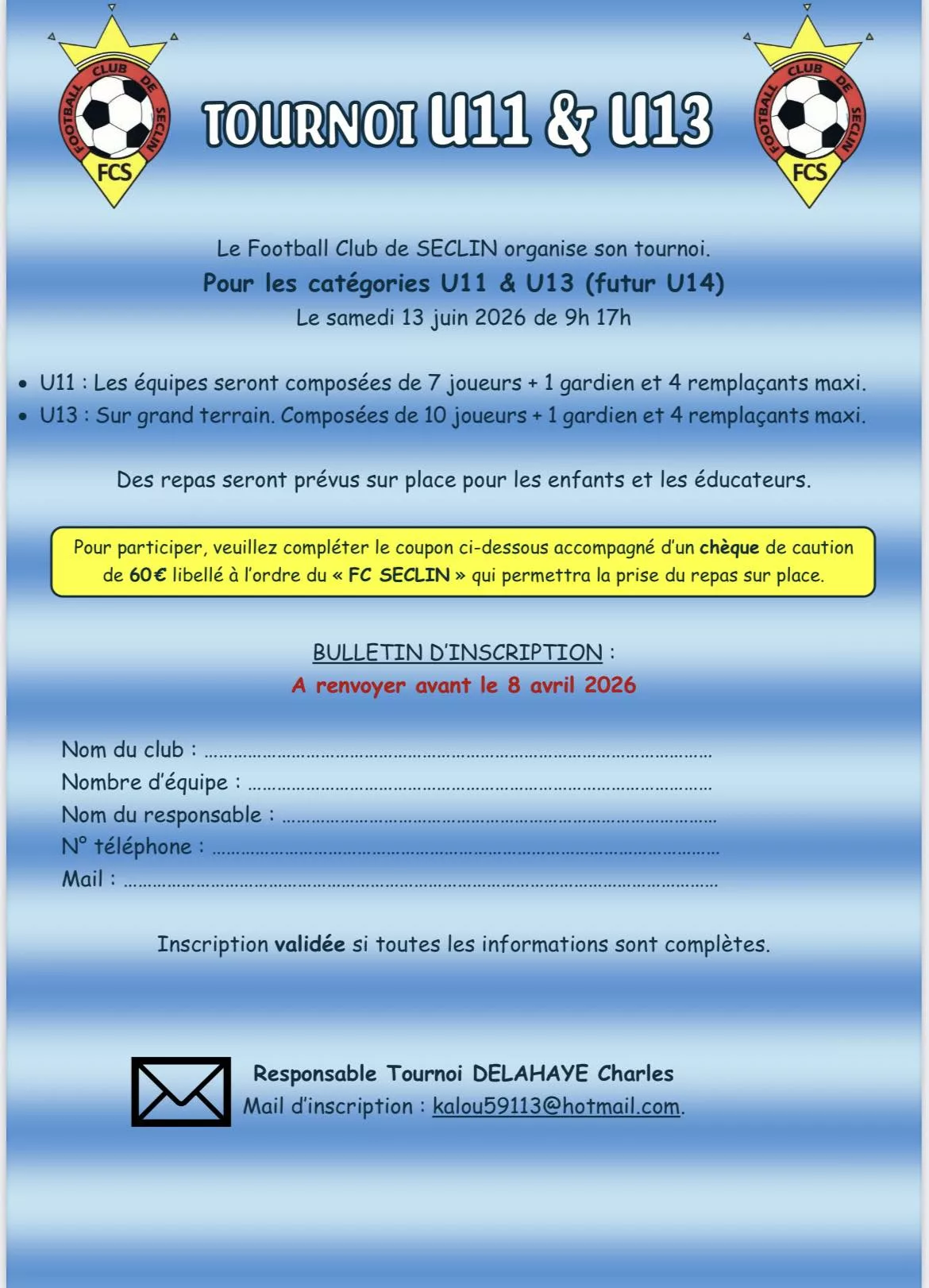 Le Fc Seclin, club des hauts de France, organise son tournoi le samedi 13 juin 2026 U11 et U13.
