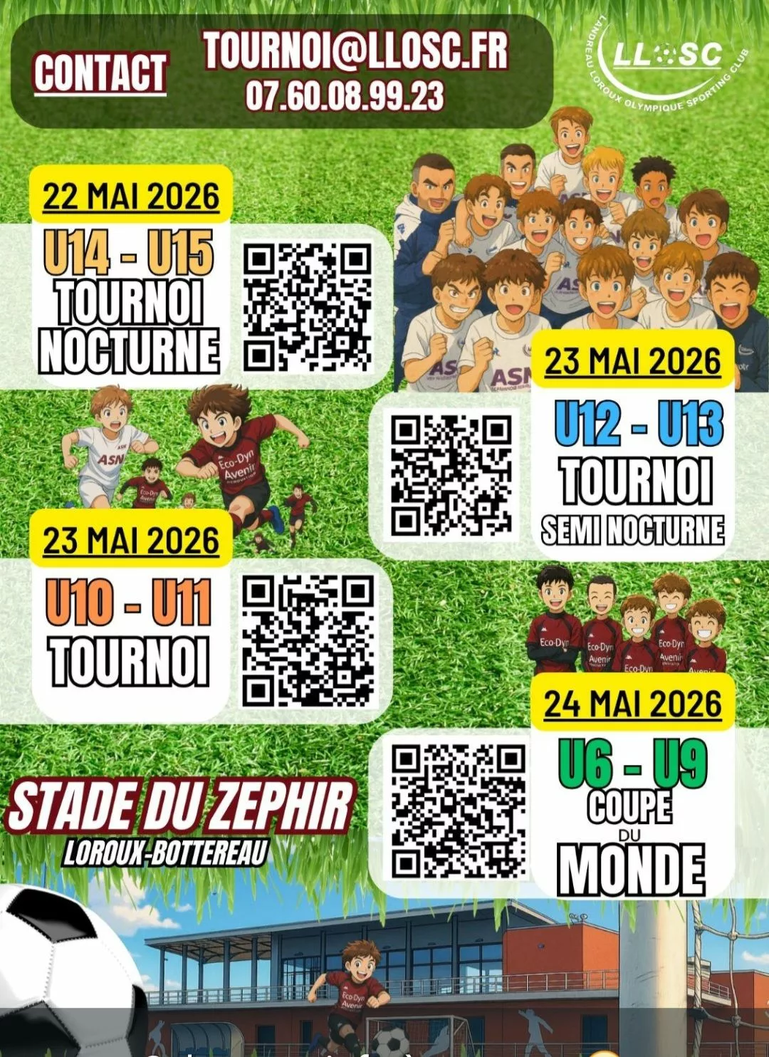 Tournoi 2026 U14 & U15 du LLOSC – Le Loroux-Bottereau Tournoi 2026 U13 du FC Pontcharra Saint Loop – Pontcharra-sur-Turdine Tournoi U7 et U9 du LLOSC – Le Loroux-Bottereau Tournoi U12 et U13 du LLOSC – Le Loroux-Bottereau Tournoi U14 et U15 du LLOSC – Le Loroux-Bottereau Tournoi U13 de l’AS Bersée