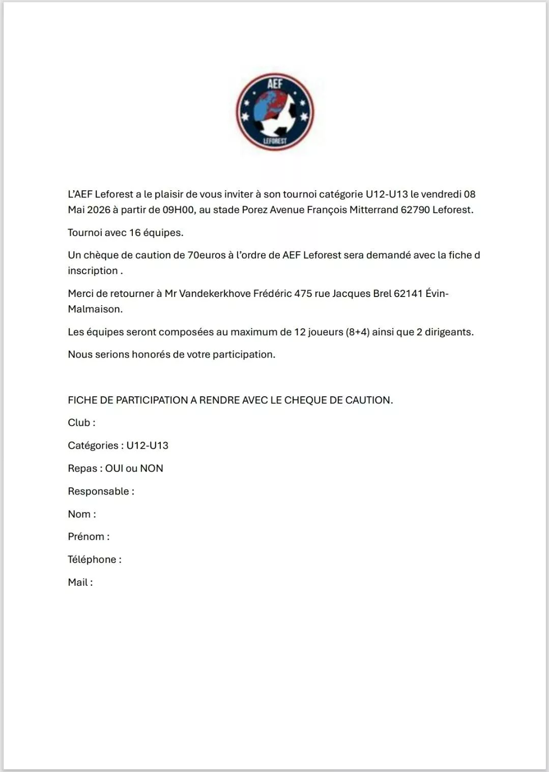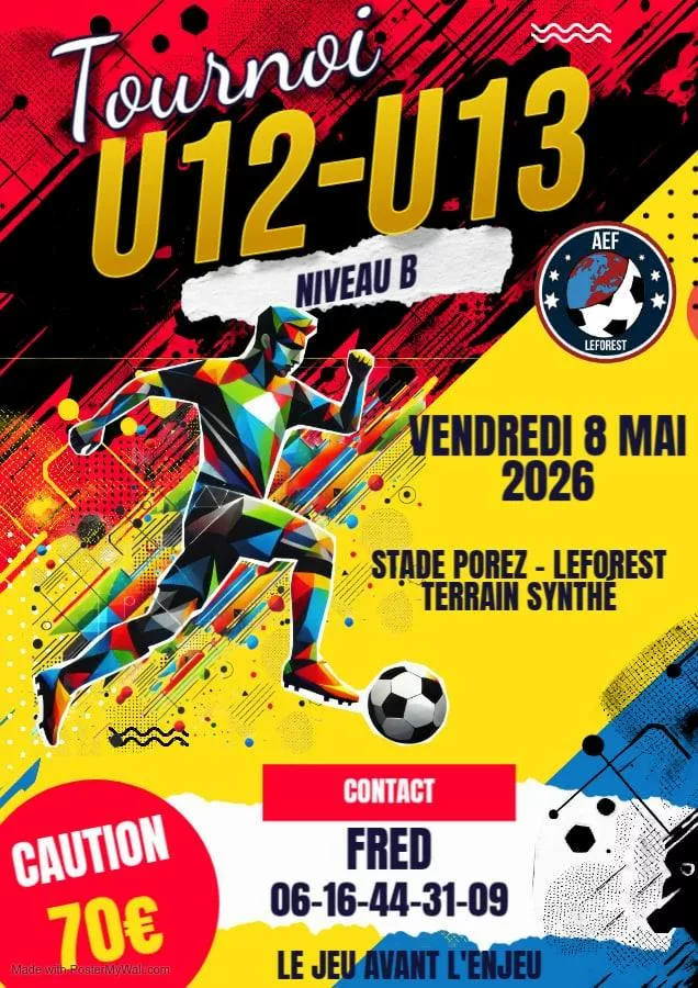 Tournoi 2026 U13 de l’ASSMT – Saint-Mathieu-de-Tréviers Tournoi semi-nocturne 2026 U13 de l’US Blaringhem Tournoi en sale 2026 U13 de l’ES Vendin Football – Vendin-le-Vieil Challenge FCESM U7 et U9 Excideuil Tournoi U13 de l’AEF Leforest Tournois U7, U9, U11 et U13 de l’US Plouisy