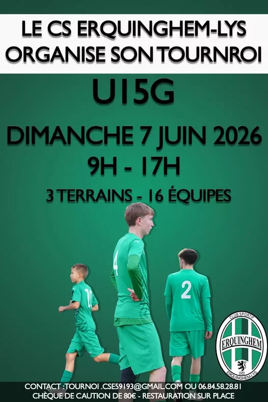 Le CS Erquinghem-Lys organise son tournoi U15 le dimanche 7 juin 2026, de 9h à 17h.