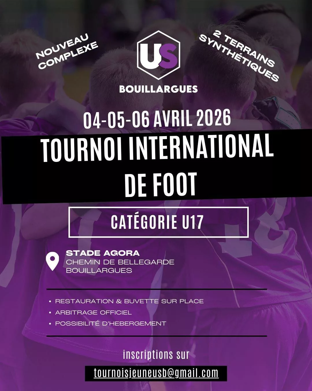 Suite à un désistement, il reste 1 place pour notre Tournoi International de Football – Catégorie U17, organisé par l’Union Sportive de Bouillargues( à côté de Nîmes) les 4, 5 et 6 avril.