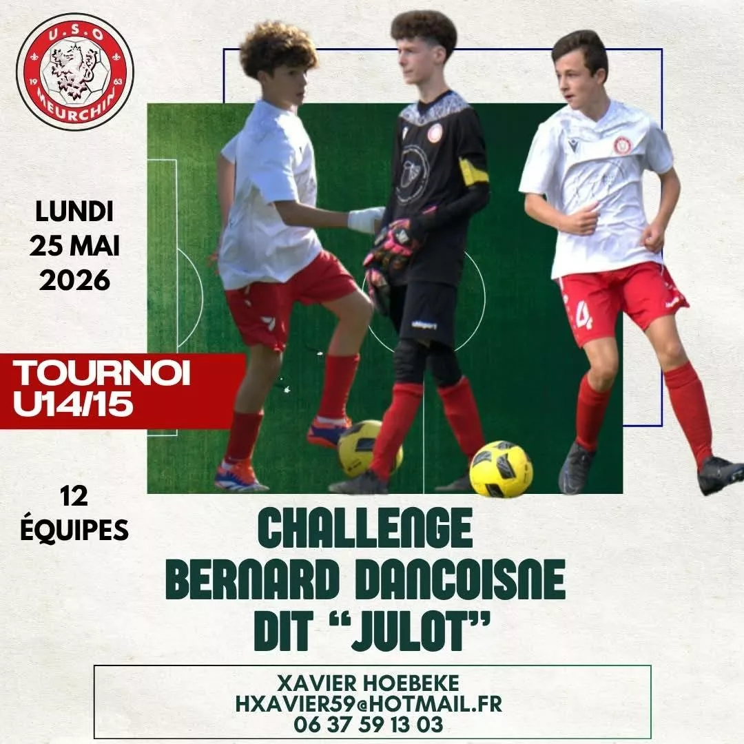 Challenge Serge Lohez 2026 U11 & Challenge Michel Penin 2026 U13 de l’USO Meurchin Tournoi Bernard Wallard 2026 U7 & U9 de l’USO Meurchin Saint-Cham Ladies Cup 2025 U15F du Saint-Chamond Foot Tournoi Bernard Bucaille U7, U9 et U11 de l’Entente Motteville Croix-Mare – Croix-Mare Challenge U11 Serge Lohez Tournoi U11 et U13 de Meurchin