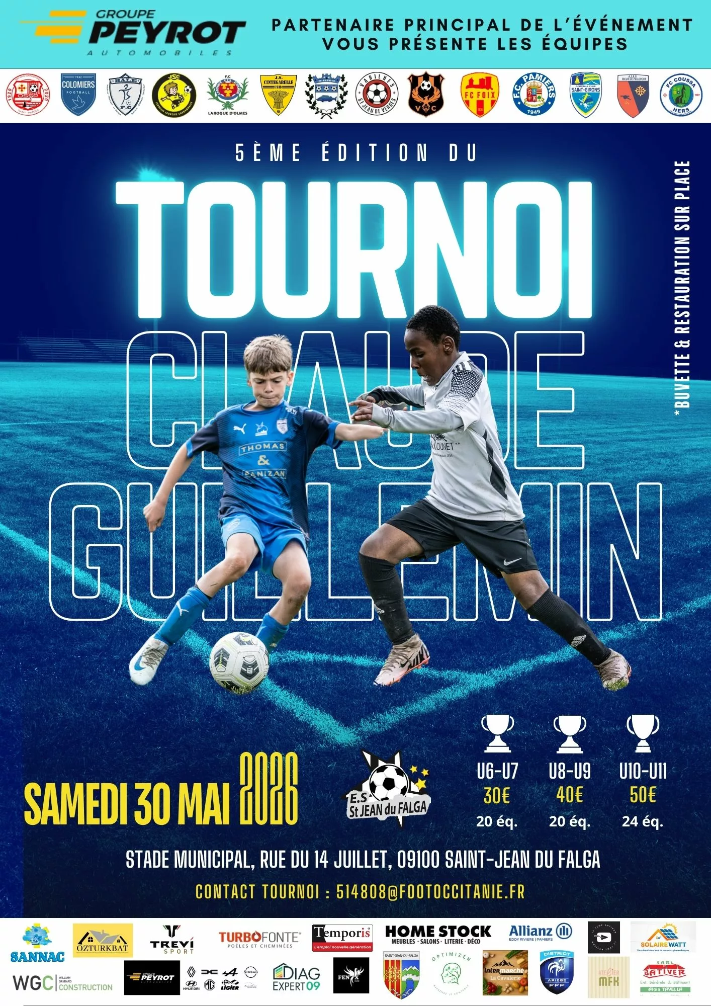 Tournoi en Ariège (09) regroupant sur 1 jour les U6-U7 (foot à 4), les U8-U9 (foot à 5) et les U10-U11 (foot à 8). Ce tournoi aura lieu le samedi 30 mai 2026 à St-Jean Du Falga. 64 équipes au total, plus de 540 enfants répartis sur de nombreux terrains en herbe. Restauration et buvette sur place. De nombreuses animations prévues. Un tournoi magnifique pour cette fin de saison. N’hésitez pas à vous inscrire.