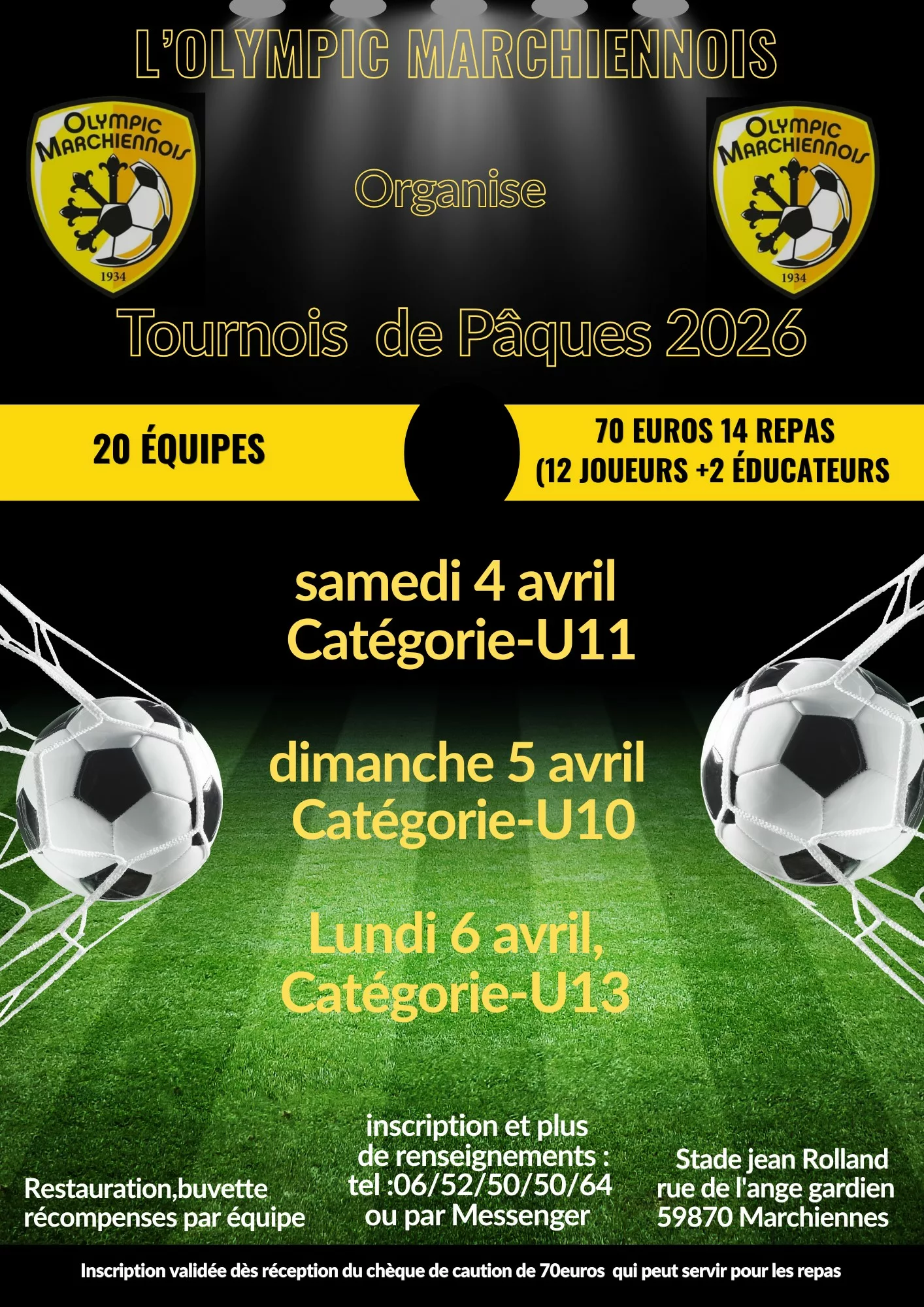 Tournoi de Pâques 2026 U11 de l’Olympic Marchiennois – Marchiennes Tournoi 2026 U12 de Bruay-sur-l’Escaut Tournoi 2026 U10 de l’Olympic Marchiennois – Marchiennes Tournoi 2026 U11 de l’Olympic Marchiennois – Marchiennes Tournoi 2025 U14 de l’Olympic Marchiennois – Marchiennes Tournoi 2025 U13 de l’Olympic Marchiennois – Marchiennes