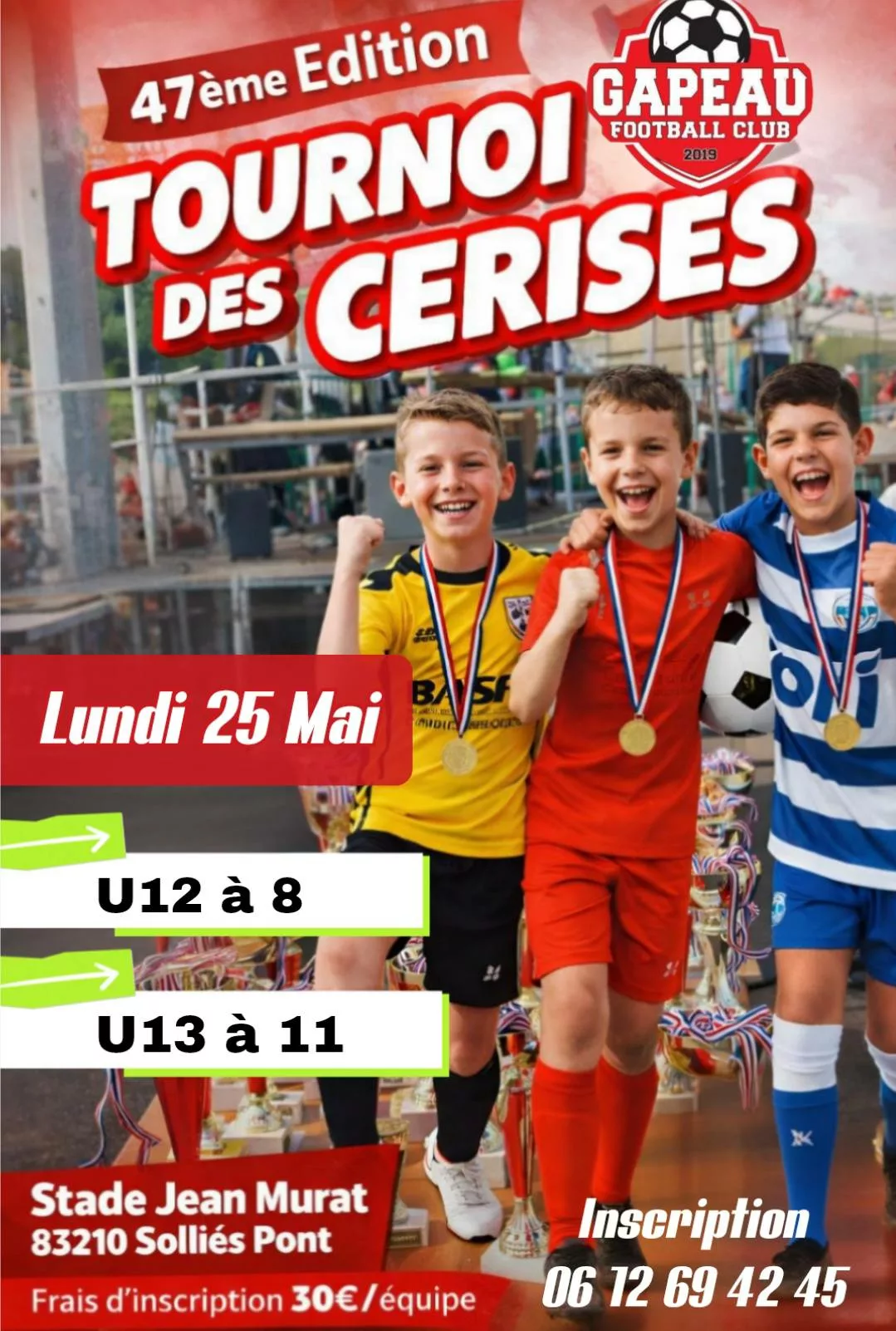 Le Club du GAPEAU FC organise son traditionnel TOURNOI DES CERISES pendant le week-end de la Pentecôte sur le magnifique complexe Jean Murat à Sollies-Pont.