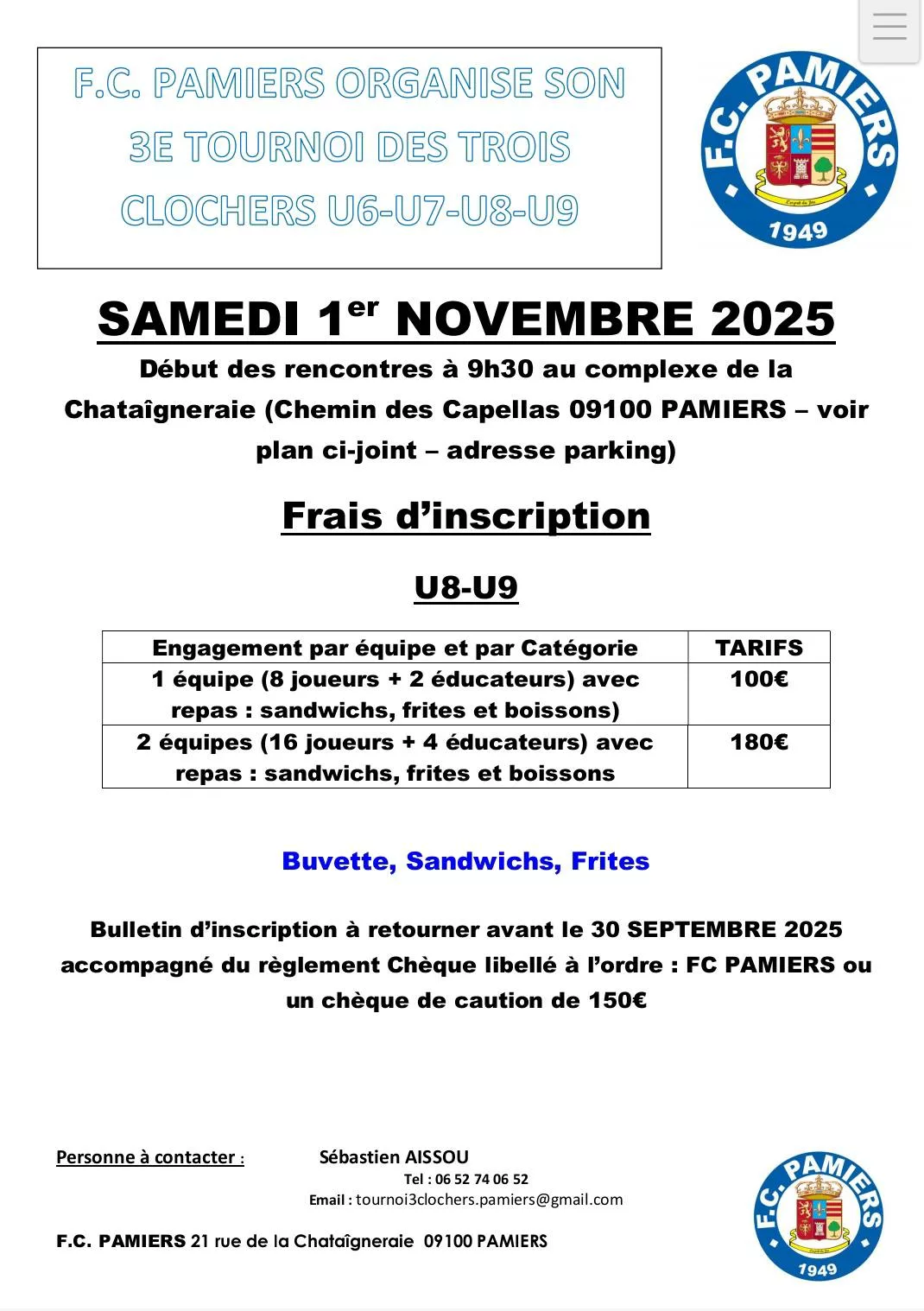 10e tournoi régional du FC Pamiers en Ariège,vous avez la possibilité d’un logement faire demande au numéro sur les plaquettes..