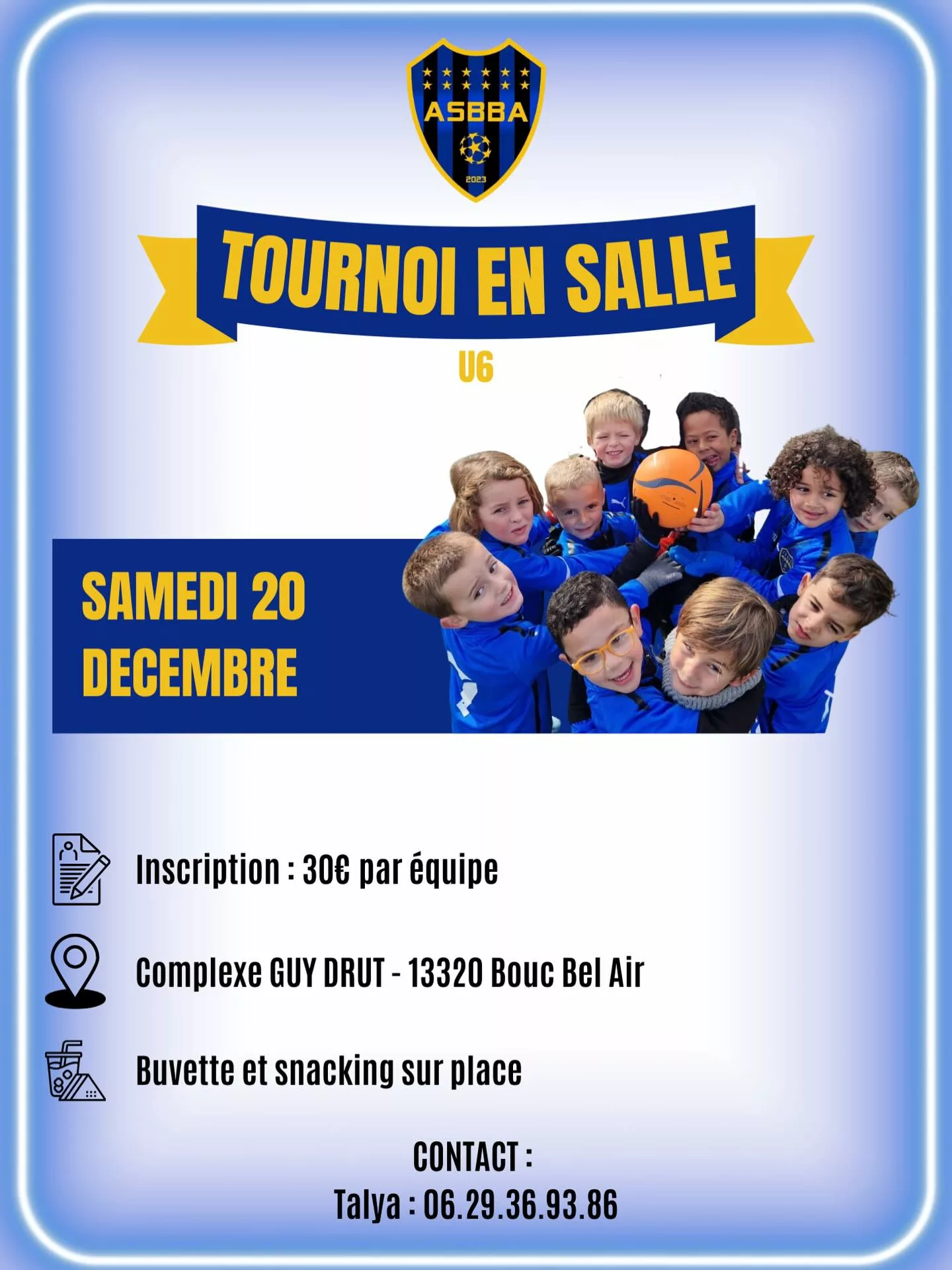 L’ASBBA organise un tournoi en salle u6 (foot à 5) le samedi 20 décembre au gymnase Guy Drut à bouc bel air.