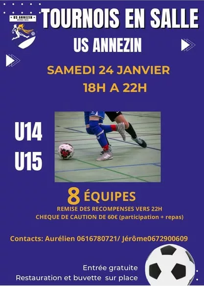 L’US Annezin 🔵⚪ organise ses tournois en salle de janvier 2026 pour les catégories U10/U11, U12/U13 en journée et U14/U15, U18 en soirée.