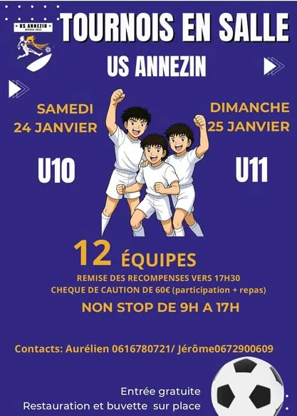 L’US Annezin 🔵⚪ organise ses tournois en salle de janvier 2026 pour les catégories U10/U11, U12/U13 en journée et U14/U15, U18 en soirée.