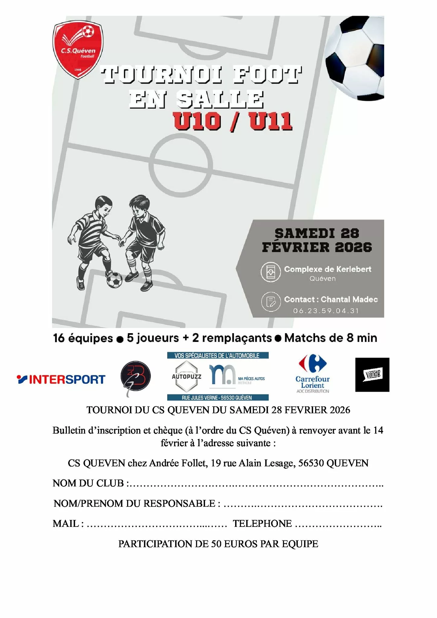 Bonjour, le CS Quéven organise son traditionnel tournoi en salle U10/U11 le 28 fevrier 2026, n’hésitez pas à me contacter pour vous pré-inscrire ou pour toutes informations complémentaires.