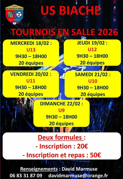 Du 18 au 22 février 2026, l’US BIACHE organise ses tournois en salle dans les catégories «U9, U10, U11, U12 et U13»