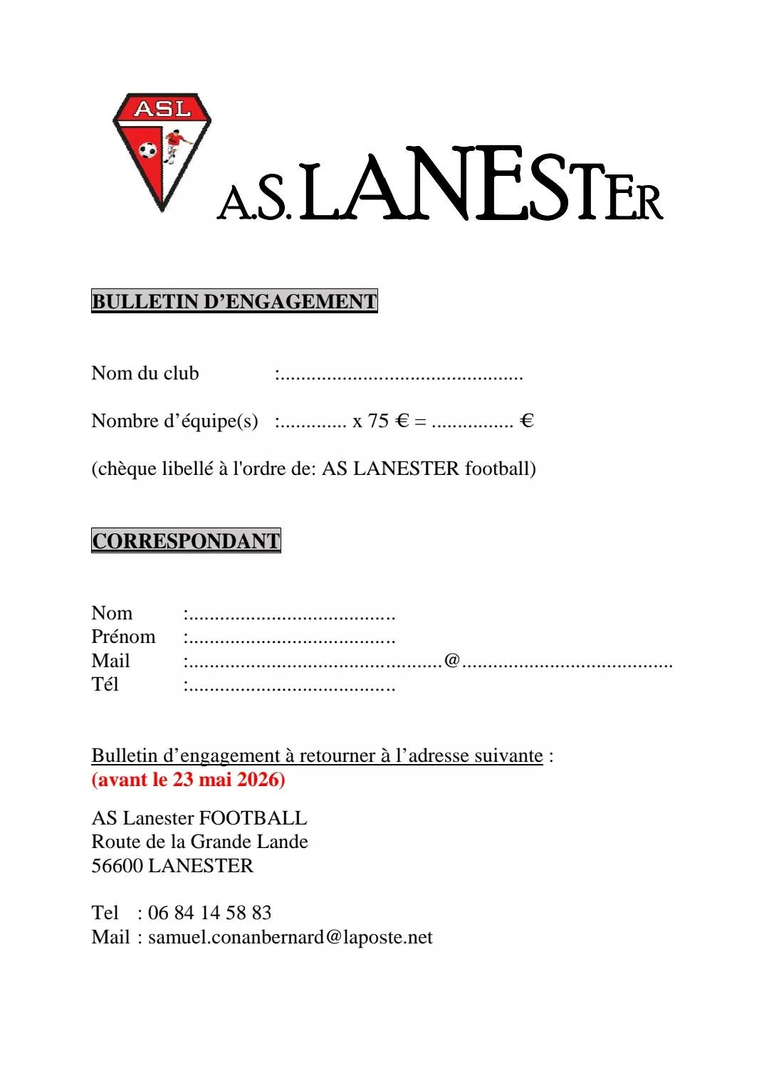 Nous sommes heureux de vous présenter la 3ème édition du tournoi U14U15 Eugène Le Cunff qui se déroulera cette année le le 6 juin 2026. Les rencontres de 15′ se font à 11 C 11 sur nos trois terrains au complexe Louis et Eric le bail à LANESTER . Les 24 équipes sont composés de 15 joueurs, 5 matchs minimum .