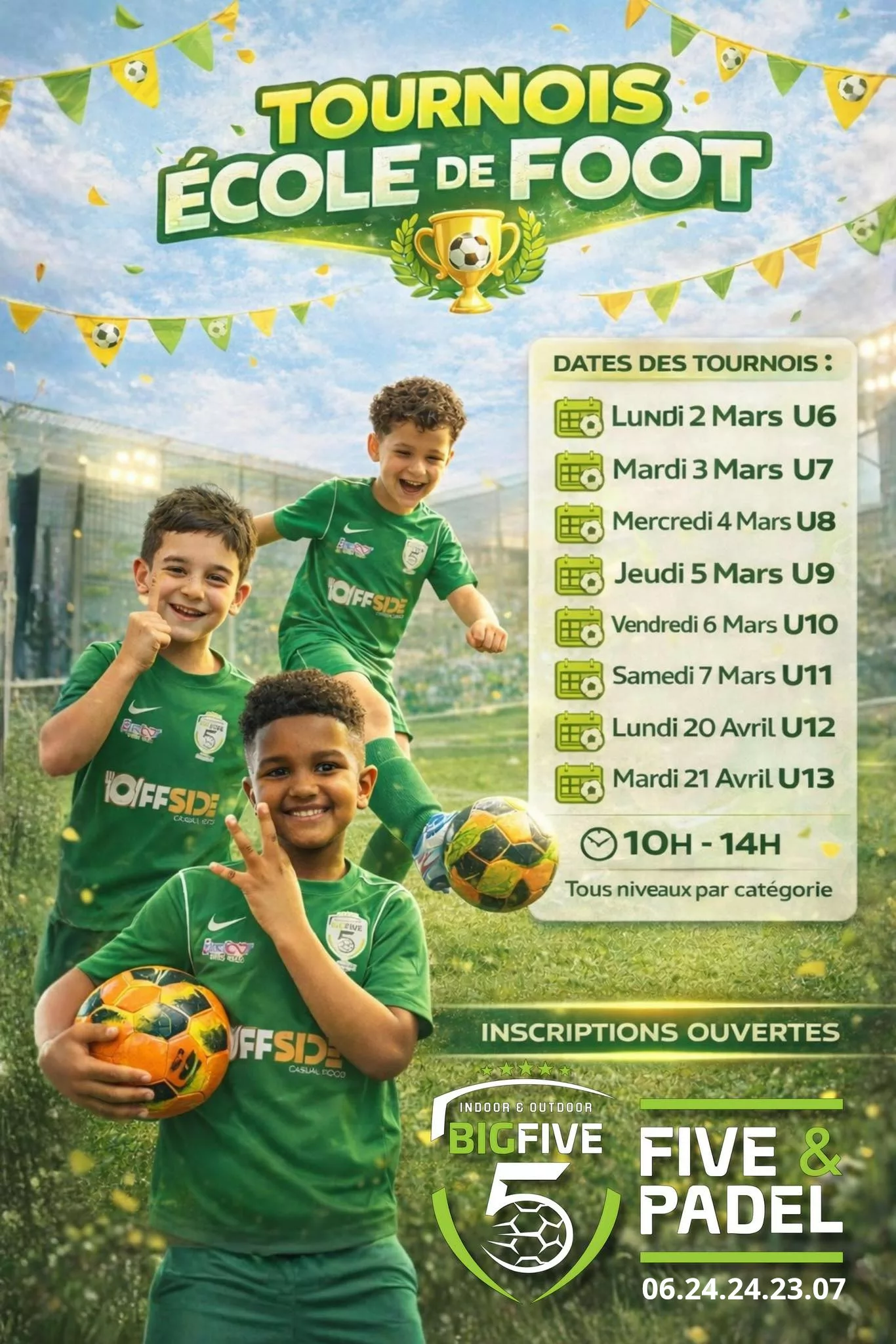 Nous avons le plaisir de vous informer de l’organisation prochaine de nos tournois École de Foot, qui se dérouleront pendant les vacances scolaires au Big Five de Saint-Brice-sous-Forêt (95).