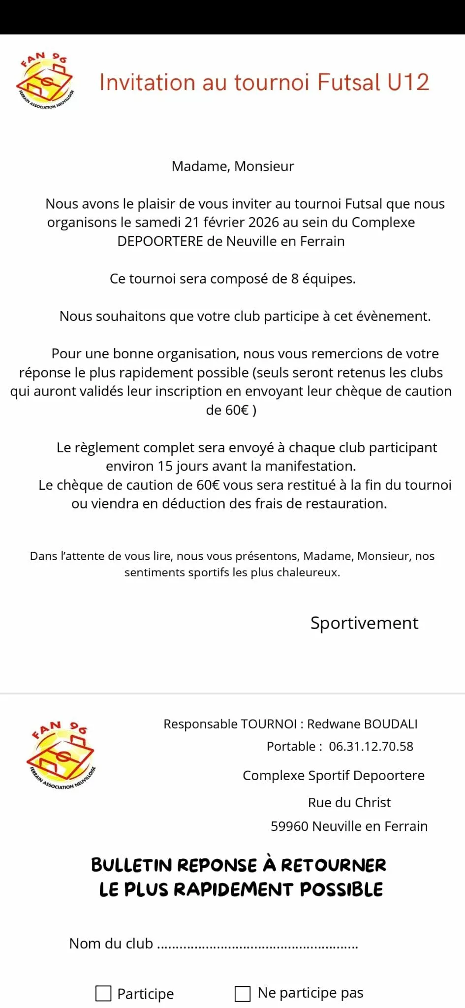 Le FAN96 organise son tournoi foot en salle U12 le 21/02.