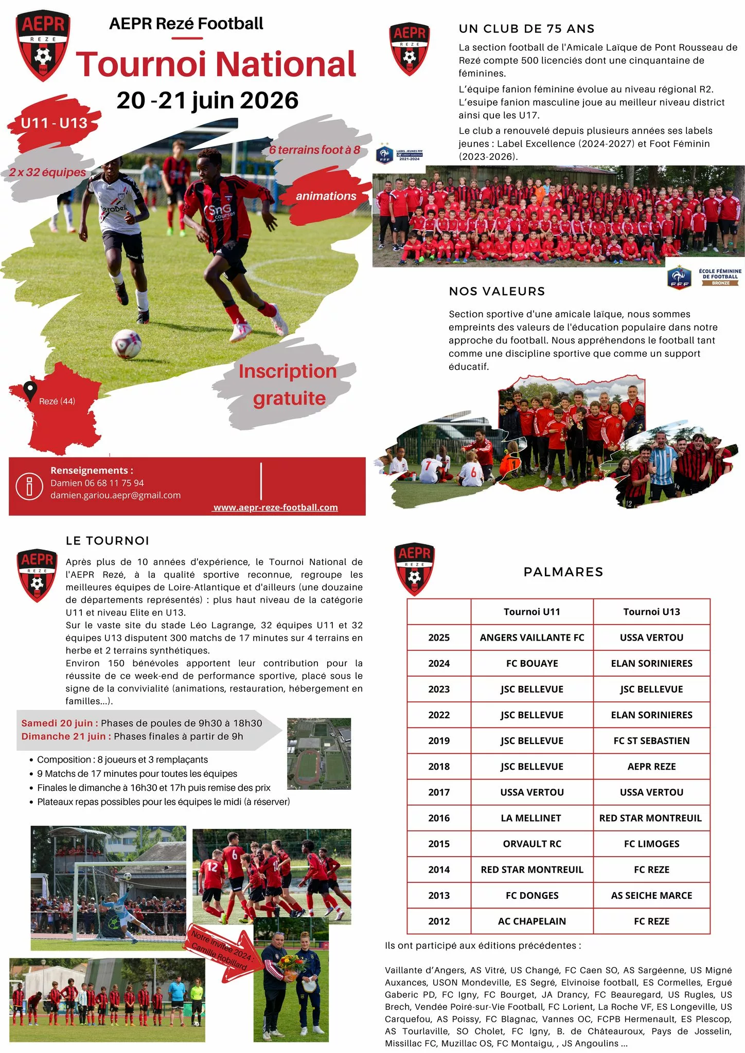 Soyez les bienvenus à notre tournoi national des 20 et 21 juin pour vos U11 et U13 sur les terrains de Rezé (44). 9 matchs de 17 minutes pour chaque équipe. Contactez-moi pour plus d’infos.