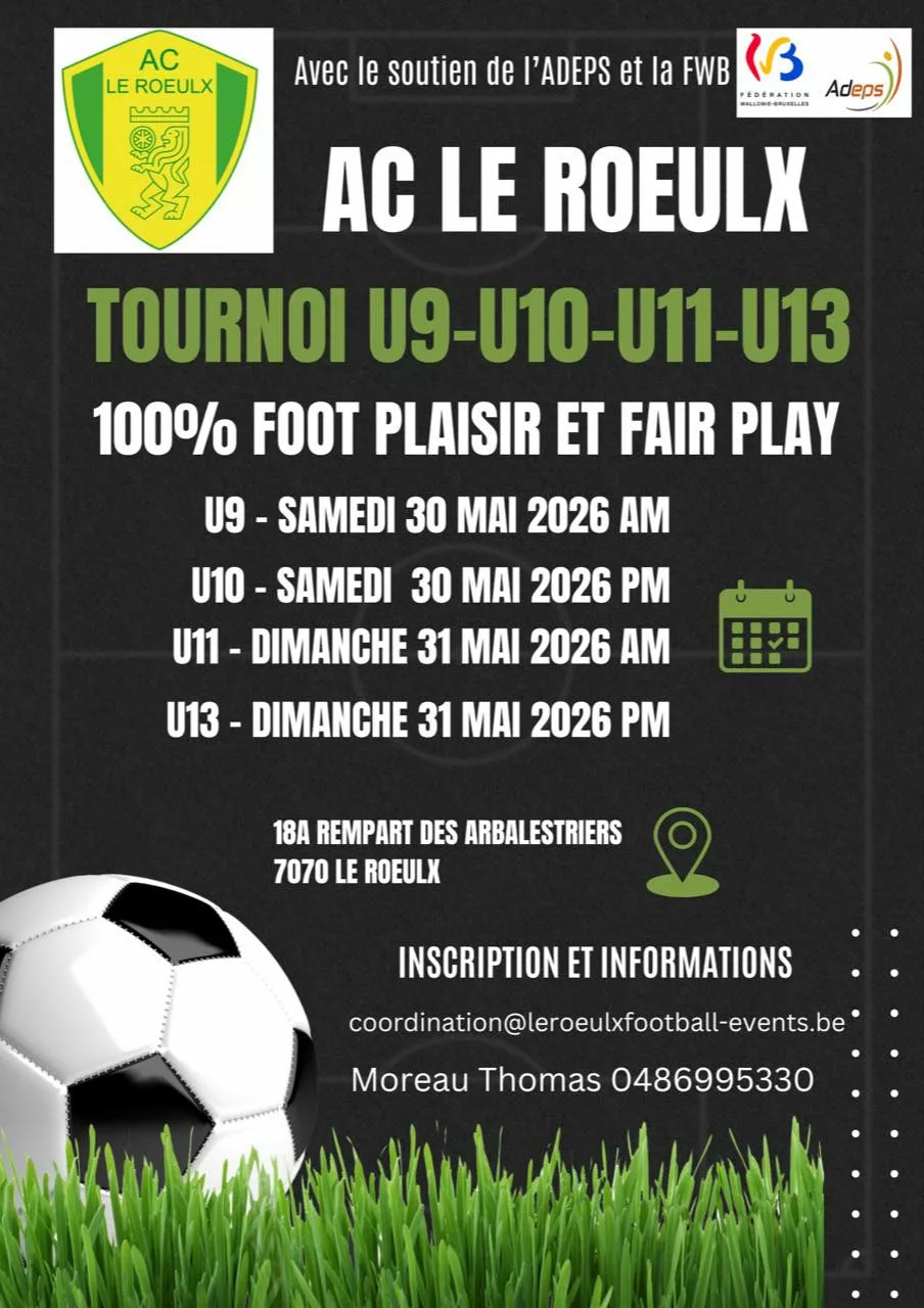 L Ac Le Roeulx vous invite à son tournoi de fin de saison le 30 et 31 mai. N hésitez pas à vous inscrire du plaisir, du foot et du fair play.