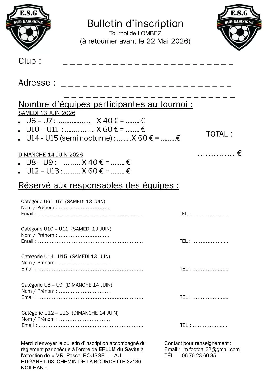 L’école de football LLM du Savès / Sud Gascogne a le plaisir de vous inviter pour la 11ème édition du Tournoi de Lombez qui se déroulera le 13 et 14 Juin 2026 au stade Paul VIGNAUX à LOMBEZ (Gers) .