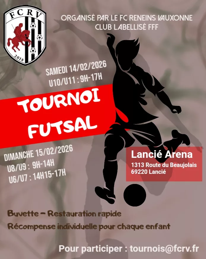 Le FC Reneins Vauxonne est heureux de vous convier à ses tournois en salle qui auront lieu pendant les vacances de février, à Lancié, dans le Beaujolais.