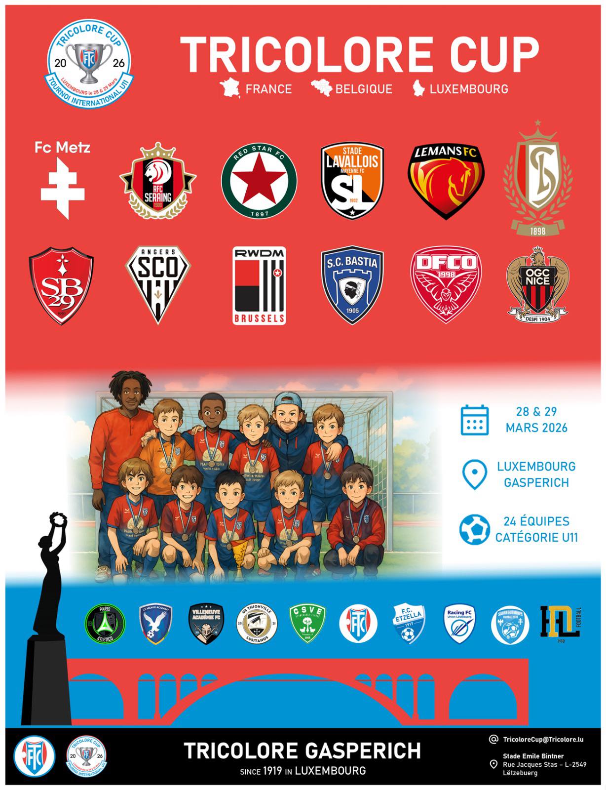 Symbole de cet événement qui rassemblera des clubs prestigieux et de nombreux jeunes talents, cette affiche marque le début du compte à rebours. Elle représente l’esprit du tournoi : la passion du football, la formation des jeunes et le plaisir de partager un grand moment de sport.