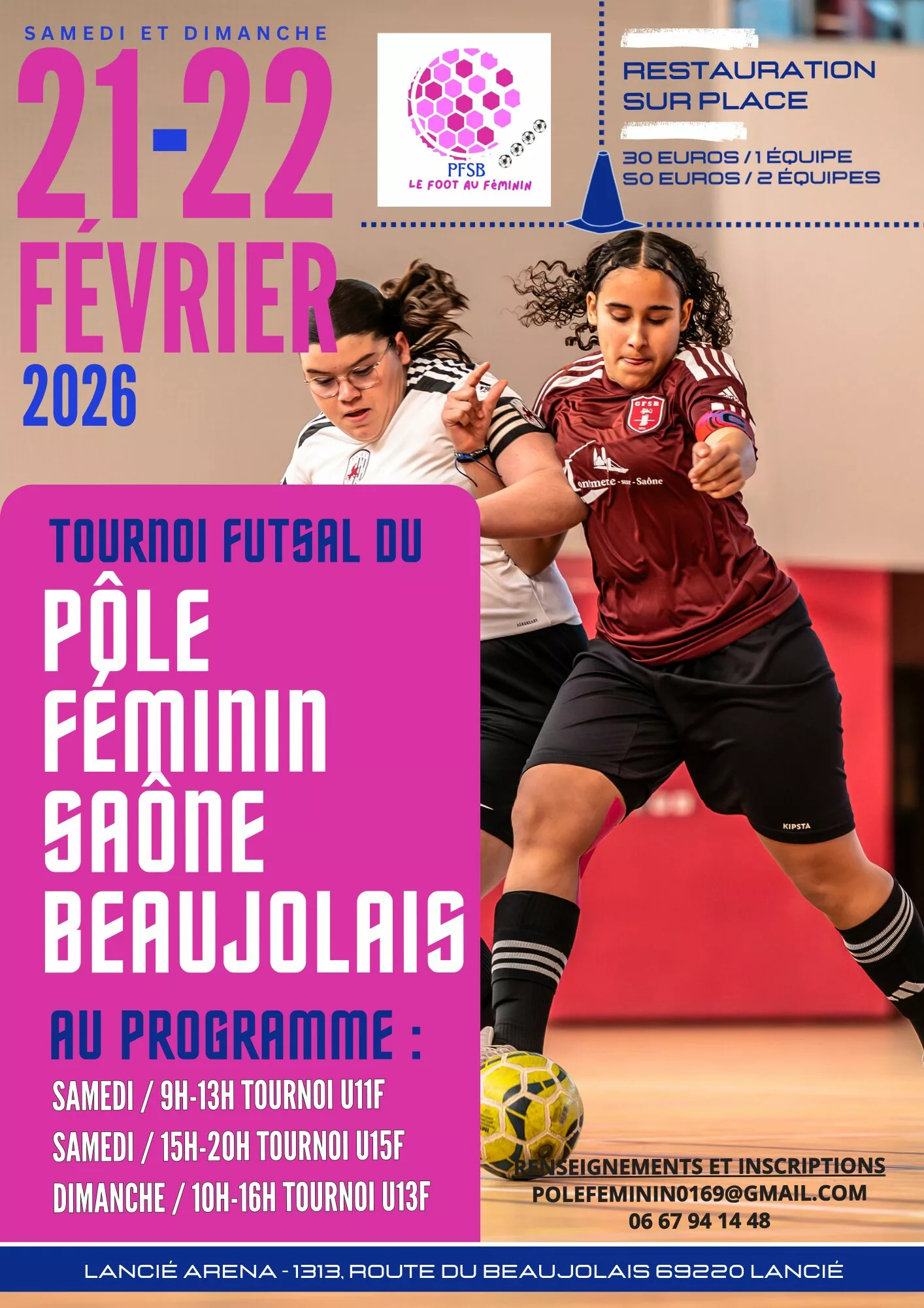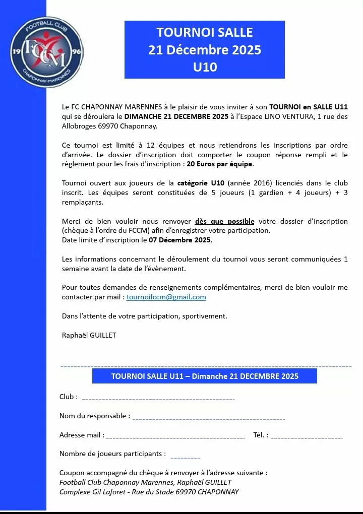 Le FC Reneins Vauxonne est heureux de vous convier à ses tournois en salle qui auront lieu pendant les vacances de février, à Lancié, dans le Beaujolais. Je reste à votre dispo si vous souhaitez plus d'infos, sur FB, par Messenger ou par mail à l'adresse tournois_at_fcrv.fr.