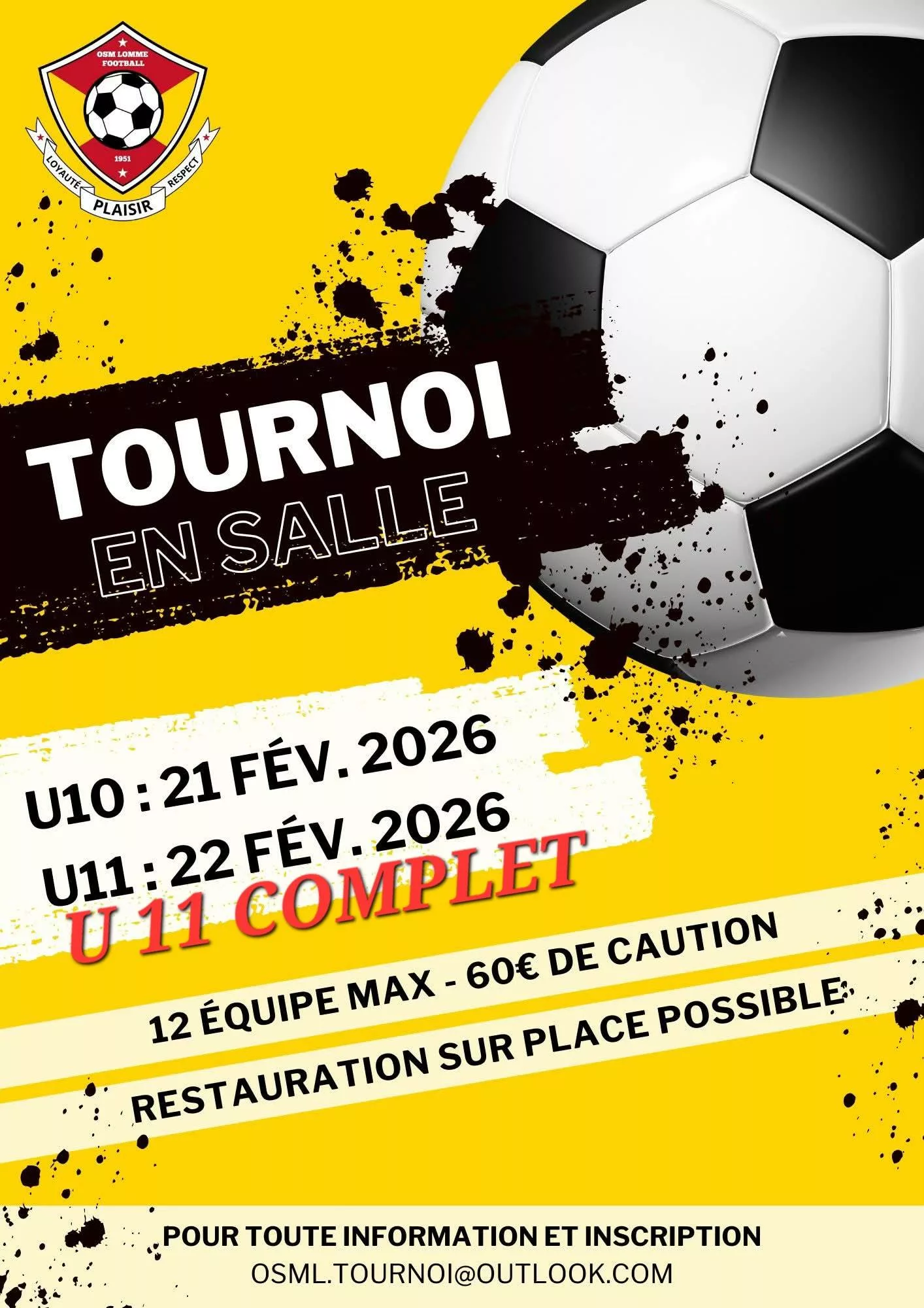 Bonjour, Tourni U10/U11 en salle le samedi 7 février 2026 à Yvrac, inscription gratuite par téléphone, buvette et restauration sur place !