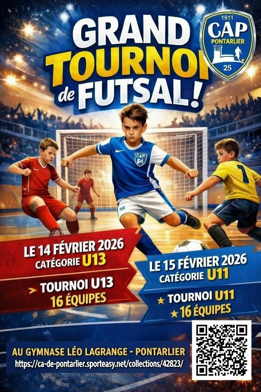 Nous vous attendons nombreux a la 1ère édition du tournois futsal du CA PontarlierPour la catégorie u13 le samedi 14 février 2026 début a 9hPour la catégorie u11 le dimanche 15 février 2026 début a 9hRESTAURATION ET BUVETTE SUR PLACEPour plus de renseignements n'hésitez pas a me MPCI-DESSOUS LE LIENS D'INSCRIPTION :https://ca-de-pontarlier.sporteasy.net/collections/42823/ROMAINCA Pontarlier