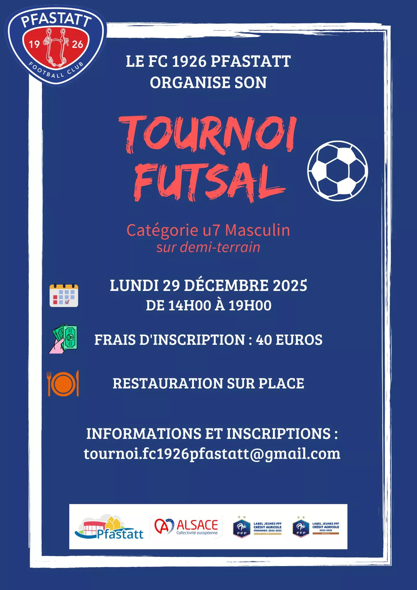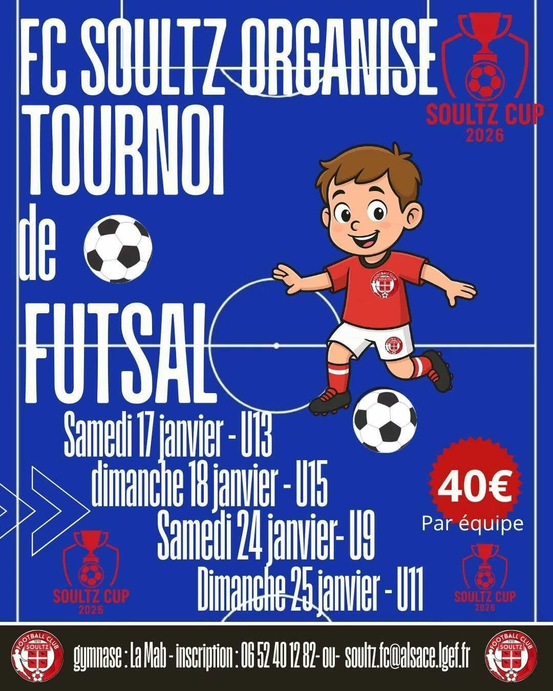 Soultz-Haut-Rhin Soultz-Haut-Rhin, FranceOrganisée par le FC Soultz 17, 18, 24 et 25 janvier 2026 Salle La Mab – Soultz Catégories : U13 : samedi 17 janvier 2026 U15 : dimanche 18 janvier 2026 U9 : samedi 24 janvier 2027 U11 : dimanche 25 janvier 2026 Rejoignez-nous pour un tournoi passionnant, rempli de jeu, de plaisir et d’une […]