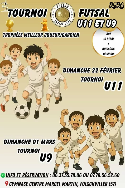 Le Folsch Futsal Club organise deux Tournois Futsal : U11 : dimanche 22 février 2026 U9 : dimanche 01 mars 2026 Les deux tournois auront lieu au Gymnase du Centre Marcel Martin – Folschviller (57730) La finale est prévue vers 17h30 Nous serions vraiment ravis de voir vos équipes participer à ces journées sportives, conviviales […]