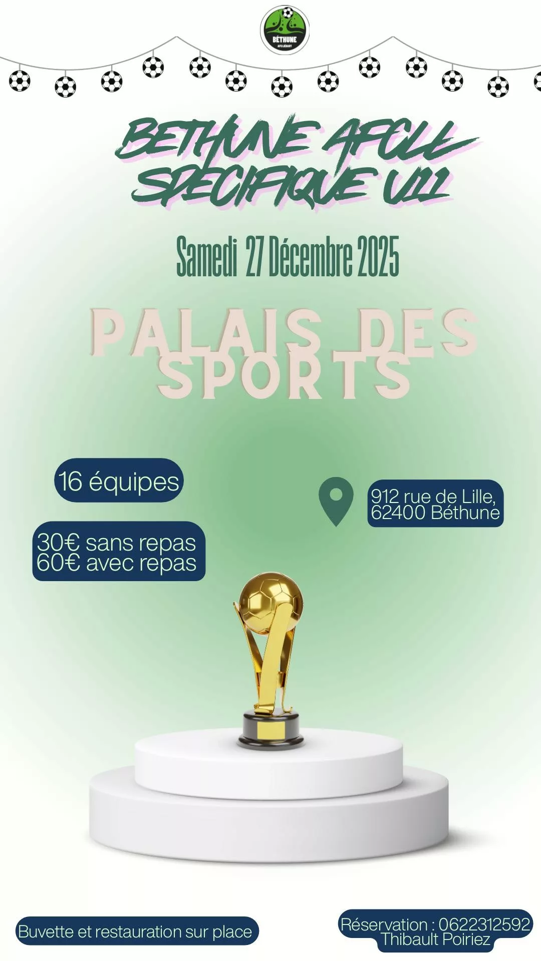 ![]() P’ti Foot, c’est fini… mais l’aventure continue ! Pour participer à nos tournois de Noël, inscrivez directement vos équipes via les liens ci-dessous " U06/U07 : https://es-guines.kalisport.com/.../tournoi-de-noel-u06... U08/U09 : https://es-guines.kalisport.com/.../tournoi-de-noel-u08...Et bien sûr, les autres catégories sont toujours de la partie : U10/U11 : https://es-guines.kalisport.com/.../tournoi-de-noel-u10... U12/U13 : https://es-guines.kalisport.com/.../tournoi-de-noel-u12... Contact : Mathieu TardieuN’hésitez pas à nous contacter rapidement pour inscrire votre équipe !𝗘𝗻𝘁𝗲𝗻𝘁𝗲 𝗦𝗽𝗼𝗿𝘁𝗶𝘃𝗲 𝗱𝗲 𝗚𝘂𝗶̂𝗻𝗲𝘀 #ESGUINES #U06U07 #U08U09 #U10U11 #U12U13 ![]() 4eme édition des phénix cup: U13F (27/12) en Futsal U13G (28/12) en Futsal U11 (29/12) en Futsal ------------------------------------ contact : olympique.lievin.tournois_at_gmail.com N'hésitez pas à me faire part de votre intérêt ! A Bientôt O-Lievin ![]() LE SAQ ORGANISE SES TOURNOIS EN SALLE ! Les dates à retenir Samedi 27 décembre 2025 → U12 / U13 Dimanche 28 décembre 2025 → U14 / U15 Samedi 3 janvier 2026 → U8 / U9 Dimanche 4 janvier 2026 → U10 / U11 - Places limitées – inscrivez-vous vite ! - Buvette & restauration […] ![]() Béthune afcll organise ses Tournois en salle au palais des sports de Béthune Attention 2 dates il y en aura pas pour tout le monde Pour une meilleure organisation réservation confirmée à la réception du paiement et de la fiche d'inscription !! Merci d'avan ![]() La Formation Calais Marck est fière de vous annoncer le 𝗡𝗼𝗲̈𝗹 𝗱𝗲 𝗙𝗼𝗼𝘁 𝟮𝟬𝟮𝟱 ! Voici les catégories ainsi que les dates sur l’ensemble du tournoi : Samedi 27 décembre :> Matin : U6/U8> Après-midi : U7/U9 Dimanche 28 décembre :> U12 + U13F Lundi 29 décembre :> U13Pour toute demande de dossier d’inscription : raphael.pierru@rccalais.fr / 06.80.63.51.07 ![]() Le FCW est heureux d’annoncer l’organisation de ses Tournois de Noël de Football dédiés aux catégories jeunes ! Une occasion festive et conviviale de partager notre passion du football dans l’esprit de Noël Inscriptions ouvertes dès maintenant ! Contact : Anaïs anaisd86_at_hotmail.com Venez nombreux partager un moment sportif et festif à la salle des sports de […] ![]() Samedi 27 & Dimanche 28 Décembre Organisé par le FC Bauvin Programme : Samedi U11 : 9h - 12h U13 : 13h30 - 17h Présence exceptionnelle de l’équipe U9 du LOSC Dimanche U8/U9 : 9h - 12h U10 : 13h30 - 17h Vétérans : 19h - 21h30 Ambiance, passion et fair-play garantis Venez nombreux encourager vos équipes et partager un super week-end foot ! Contact : David Lallemant |