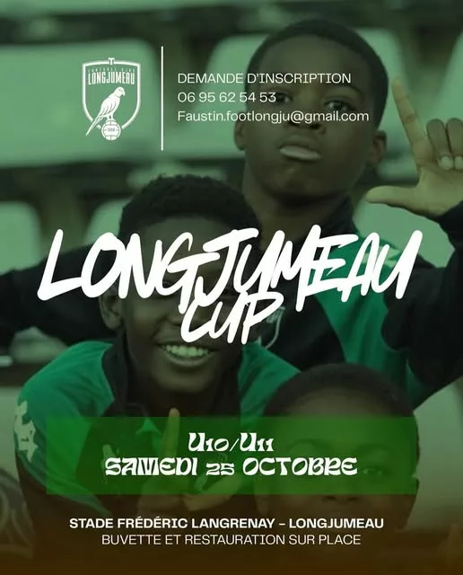 Le FC Longjumeau organise la LONGJUMEAU CUP Samedi 25 octobre 2025 Stade Frédéric Langrenay (91) Catégories U10 & U11 Inscriptions ouvertes dès maintenant ! 06 95 62 54 53 faustin.footlongju@gmail.com @fclongjumeau