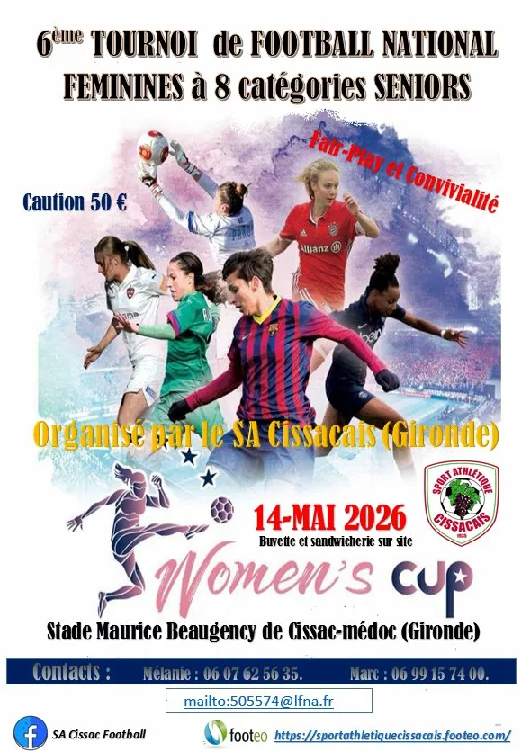 Le SA Cissacais (Gironde) organise le jeudi 14 mai (Ascension) son 6ème Tournoi de Football National Féminines à 8 catégorie Séniors F et Loisirs F.Nous pouvons accueillir 32 équipes de France Métropolitaine, des DOM-TOM et pays limitrophesEngagement gratuit, chèque de caution de 50€ demandé rendu le jour du tournoi.Plaquette et bulletin d'engagement sur simple demandephilippegoulee_at_free.frAu […]