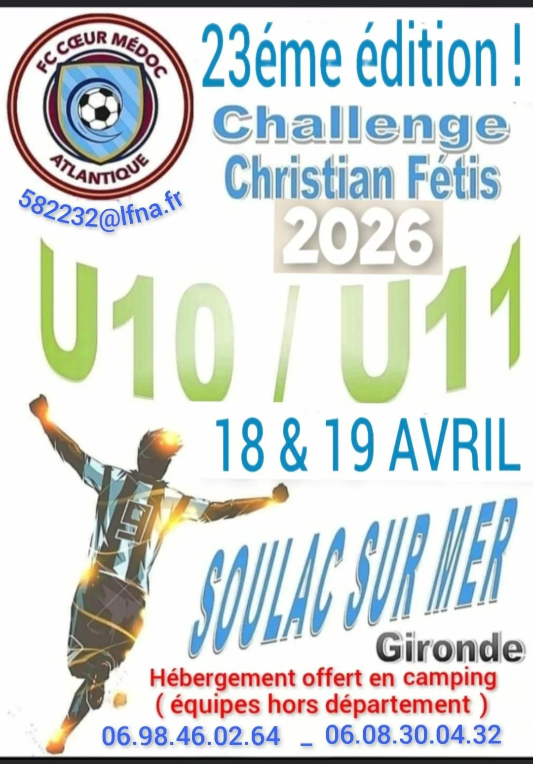Notre club organise son traditionnel tournoi annuel.Vous trouverez en pièce jointe l'affiche et tous les renseignements nécessaires.Nous serions très heureux de vous accueillir sur nos terrains.SportivementMarcoUS COUTRAS FOOTBALL