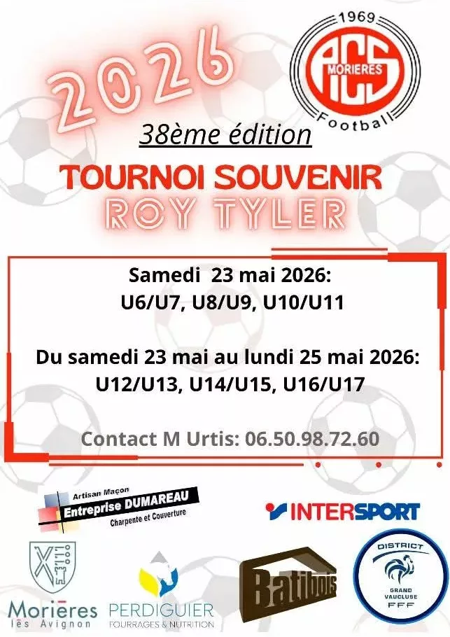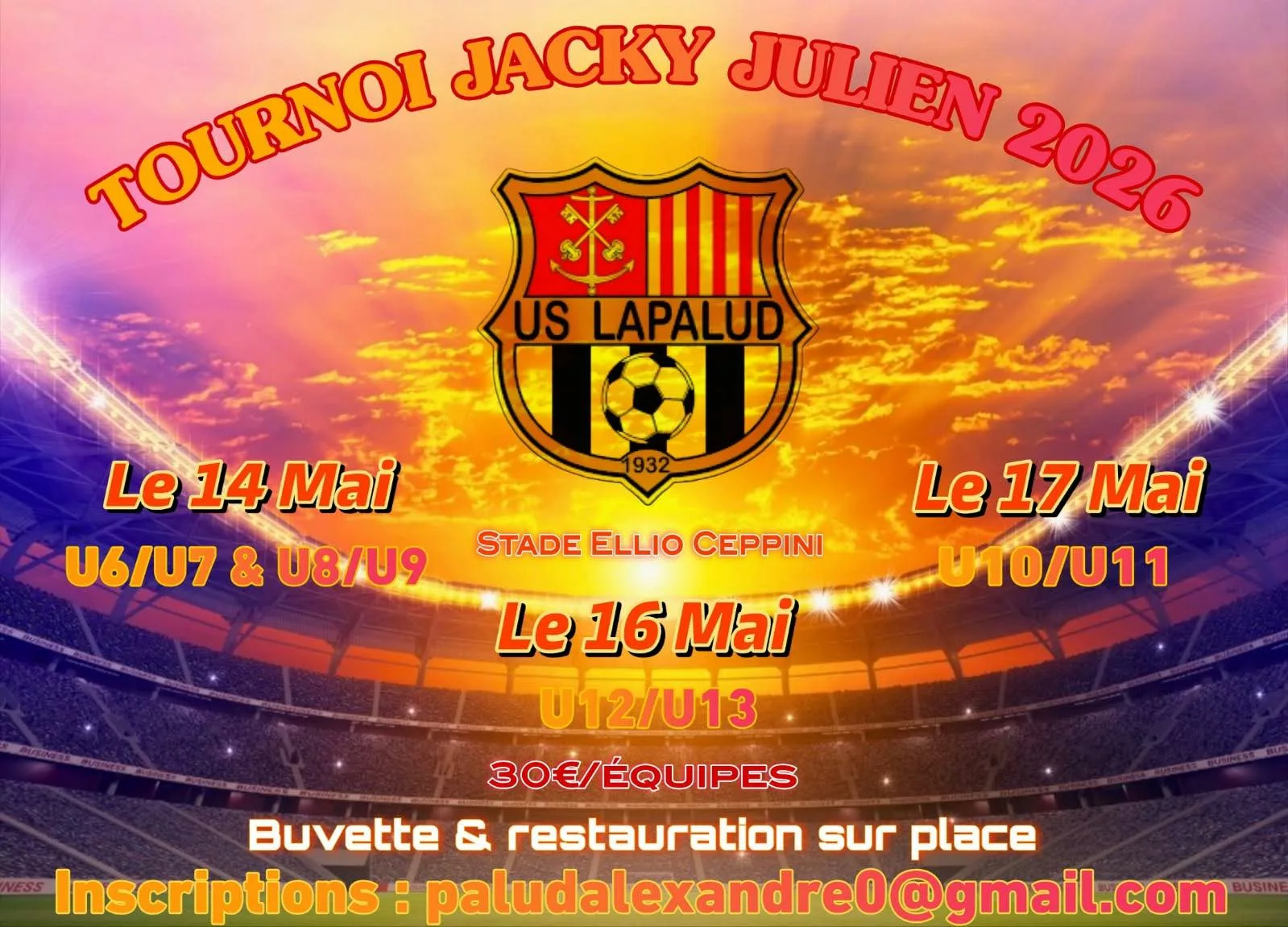 Voici les dates de nos tournois de fin de saison :• 14 mai 2025 : catégories U6, U7, U8, U9• 16 mai 2025 : catégories U12, U13• 17 mai 2025 : catégories U10, U11Pour tout renseignement ou inscription, veuillez contacter directement l’adresse mail suivante :paludalexandre0_at_gmail.com