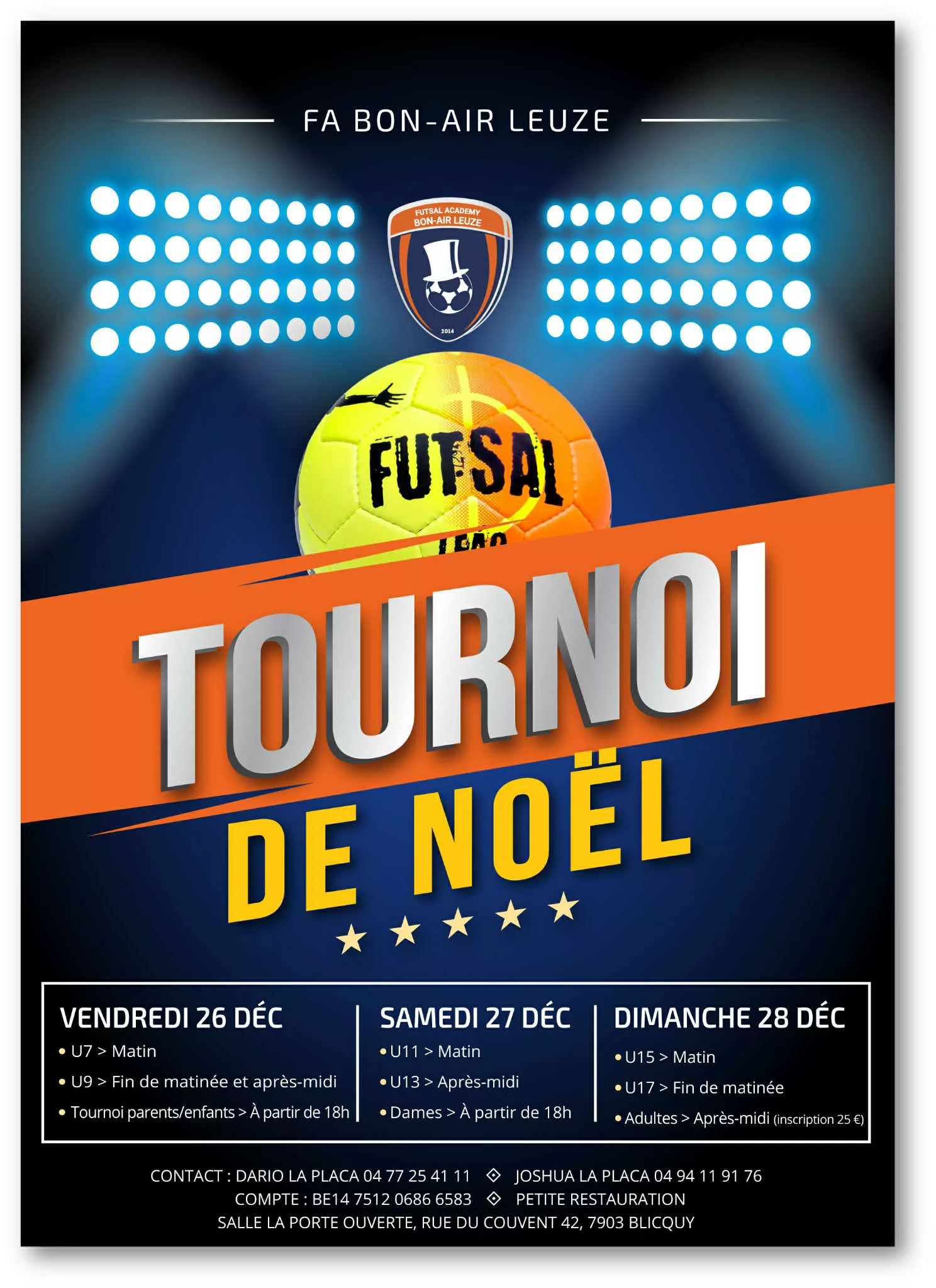 1er tournoi futsal nocturne seniors, le vendredi 19 décembre. Notre dossier d'inscription sur demande ! |