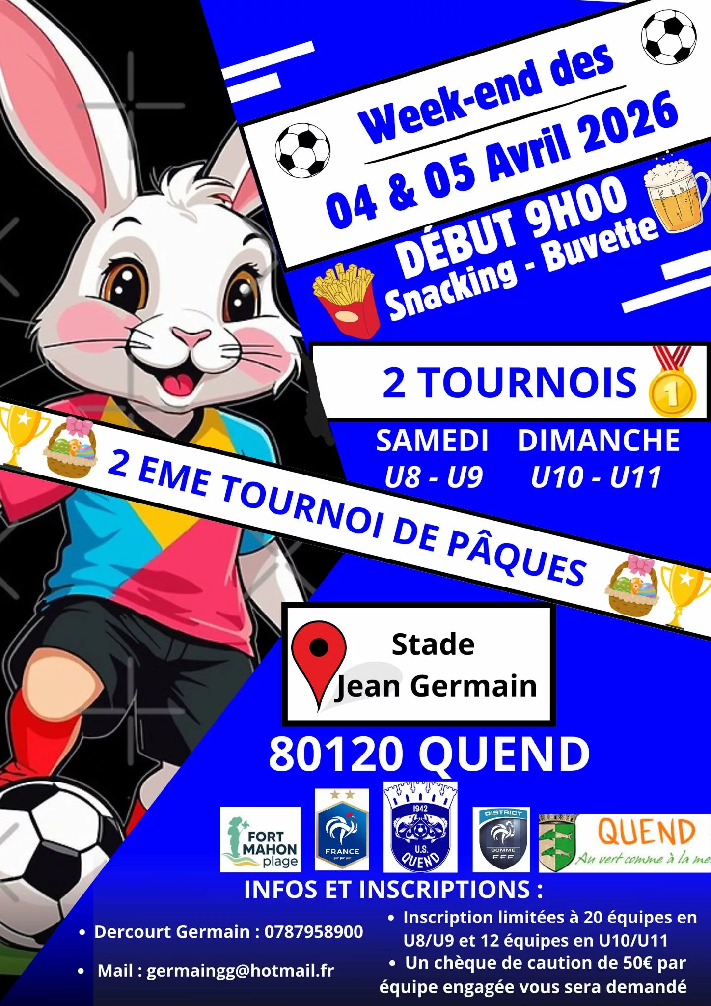 L’US QUEND organise son 2ᵉ tournoi de Pâques et vous attend nombreux ! À seulement 5 km des plages de sable fin Un cadre idéal pour allier football et convivialité Samedi 4 avril : U8 / U9 Dimanche 5 avril : U10 / U11Ambiance conviviale, sourires, plaisir du jeu et fair-play garantis tout au long du week-end Attention, il reste […]