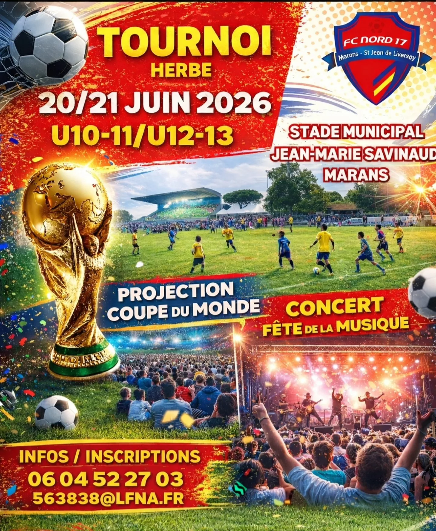 Le FC Nord 17 à le plaisir de vous inviter à son tournoi annuel sur herbe : U10 / U11 : samedi 20 juin 2026 U12 / U13 : dimanche 21 juin 2026 Toutes les informations et modalités d’inscription via le lien ci-dessous. — hyper bien, avec Causette à Marans et 4 autres personnes , à FC Nord 17.